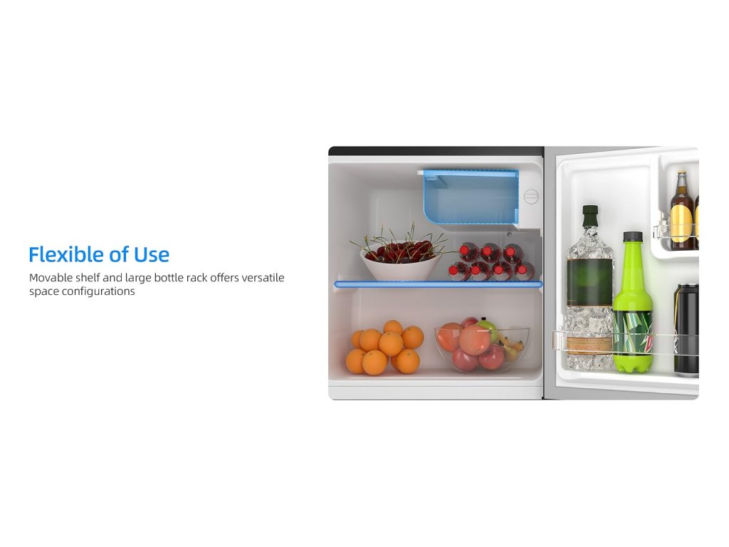 Minibar má skleněnou poličku uprostřed, chladící box a dvě přihrádky ve dveřích. Vše si do něj přehledně uložíte.