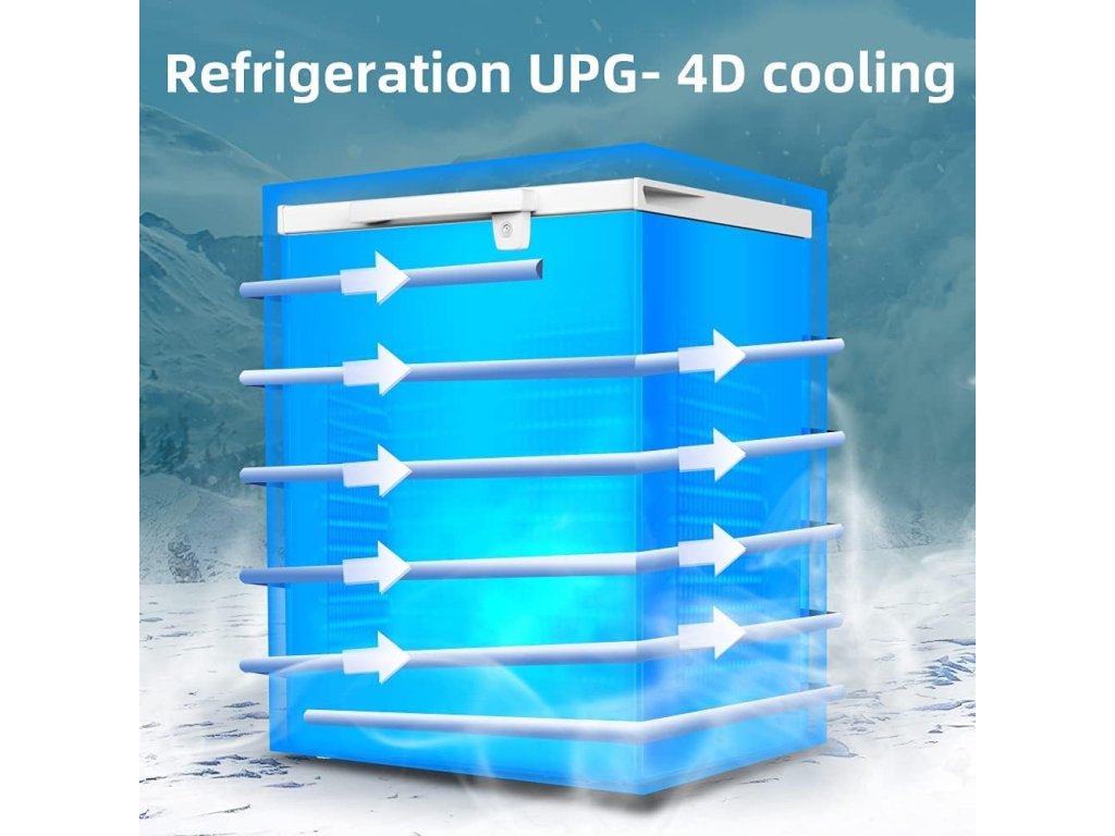 4D chlazení s výparníky těsně kolem zesílené pěnové tepelně izolační vložky, díky níž je mrazák úsporný. Chladný vzduch postupuje do středu mrazáku ze čtyř stran, a tak je vnitřní chladná teplota rovnoměrná. Uvnitř je hliníková vložka, chlazení je zajištěno kovovým vedením zajišťujícím rychlé zchlazení.
