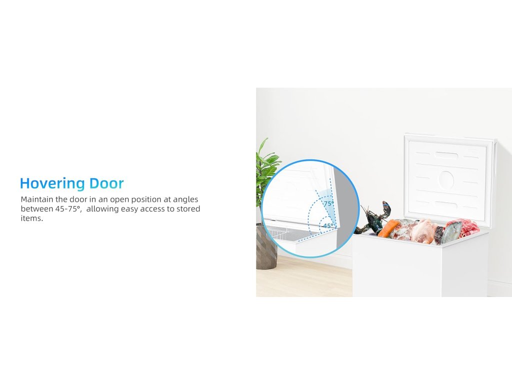 Víko drží otevřené v úhlech od 45° do 75°, což vám umožní mít volné ruce pro snadné ukládání či odebírání potravin. Posuvný koš i LED světlo Vám pomůže vše rychle uložit nebo najít.