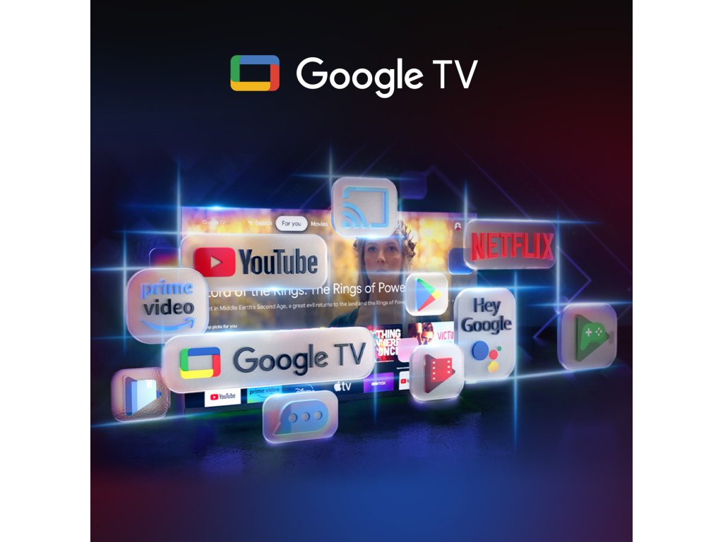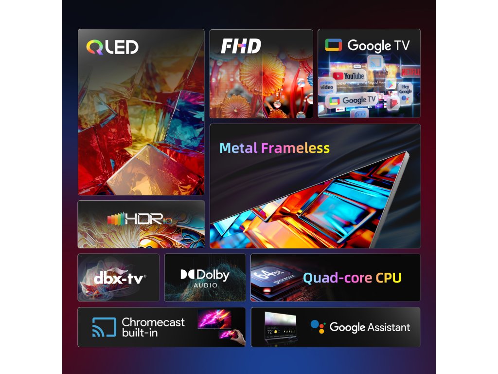 Nová bezrámečková Full HD QLED Google TV ve stříbrném provedení s Dolby Audio, vylepšeným zvukem dbx-tv a wi-fi 5G.