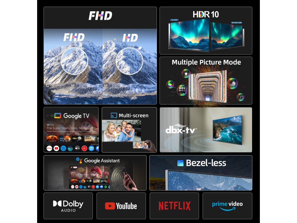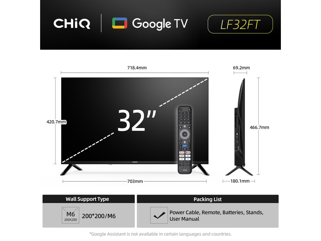 CHiQ 32“ LF32FT, ultratenká bezrámečková Smart Google TV, HDR10 / HLG, obrazovka Full HD s rozlišením 1920 x 1080 pixelů