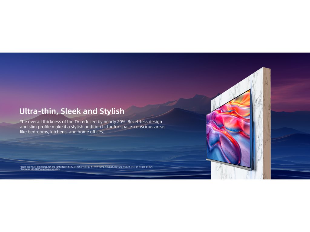 CHiQ TV přináší skvělý filmový zážitek, velké zorné pole a široký pozorovací úhel. Se zavedením nové generace procesu optického spojování mohou být televizní rámy tenčí a užší. Tím se vytvoří větší zobrazovací plocha na stejné velikosti.