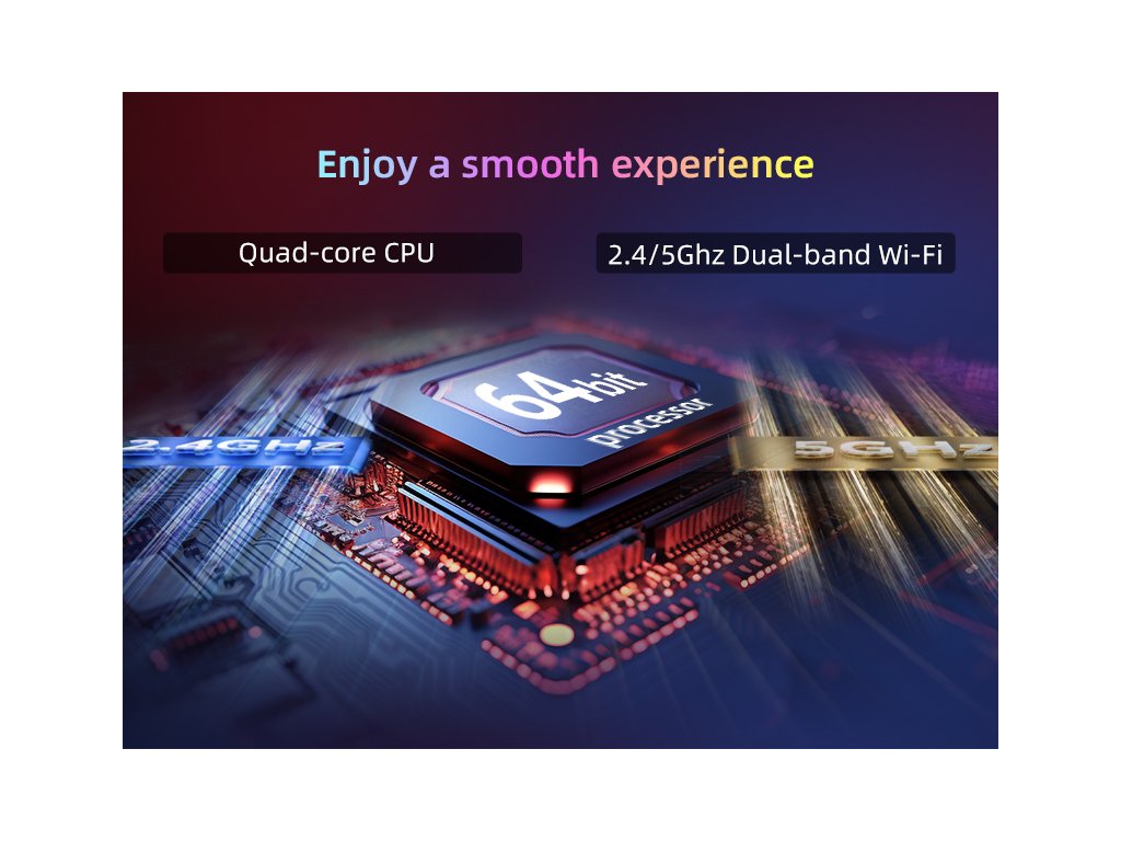 Vysoce výkonný 64bitový čtyřjádrový procesor A55 využívá nejnovější technologii nanočástic a dokáže snadno dekódovat video streamy z různých formátů. Jeho chod je zcela plynulý a garantuje rychlou odezvu. Domácí zábava ještě nikdy nebyla tak skvělá. Navíc velká 8G kapacita paměti vám umožní nainstalovat velké množství aplikací a přitom zachovat dostatek volného místa.