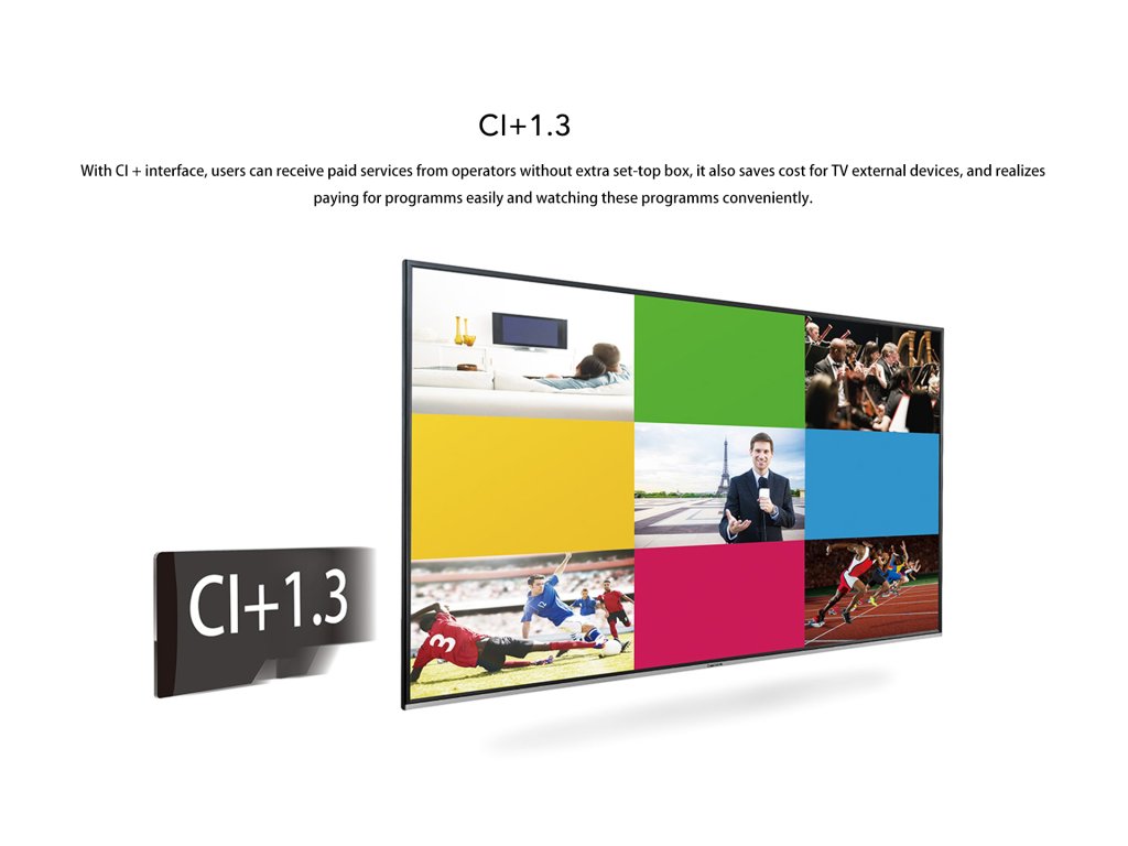 Díky rozhraní HDMI a USB vám televizor umožňuje snadno připojit USB flash disky, počítače, reproduktory nebo herní konzole a mnoha způsoby využívat jeho výkonné funkce. Televizor je vybaven CI+ slotem, 2 x HDMI, 1 x USB, výstupem pro sluchátka 3,5 mm, 1 x AV vstupem, 1 x optickým výstupem pro digitálním zvuk, 1 x ANT RF a 1 x LNB.