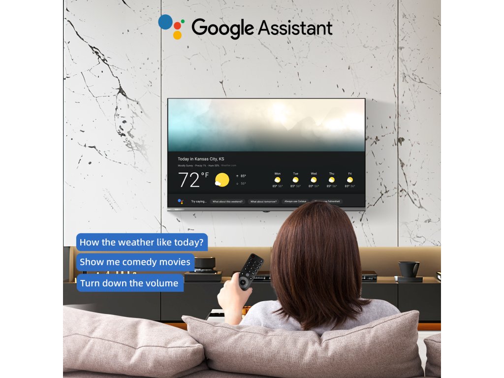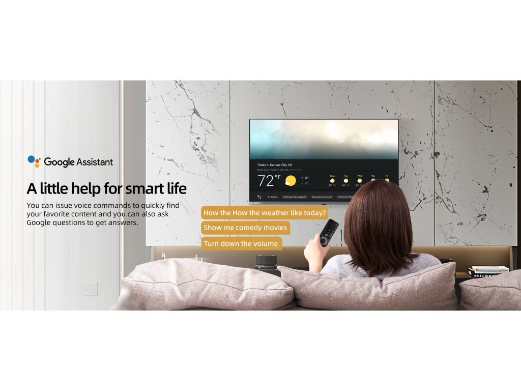 Použijte dálkové ovládání a hledejte obsah, který vás zajímá, jednoduše hlasem. Google Asistent Vám pomůže zkontrolovat počasí, vyhledat filmy nebo televizní programy. Stačí se jen zeptat. Získáte rychlý přístup k zábavě, odpoví na vaše otázky. Pomocí hlasu můžete ovládat další chytrá zařízení v domácnosti. Stačí stisknout tlačítko "Google Assistant" na vašem dálkovém ovladači a sdělit váš pokyn.