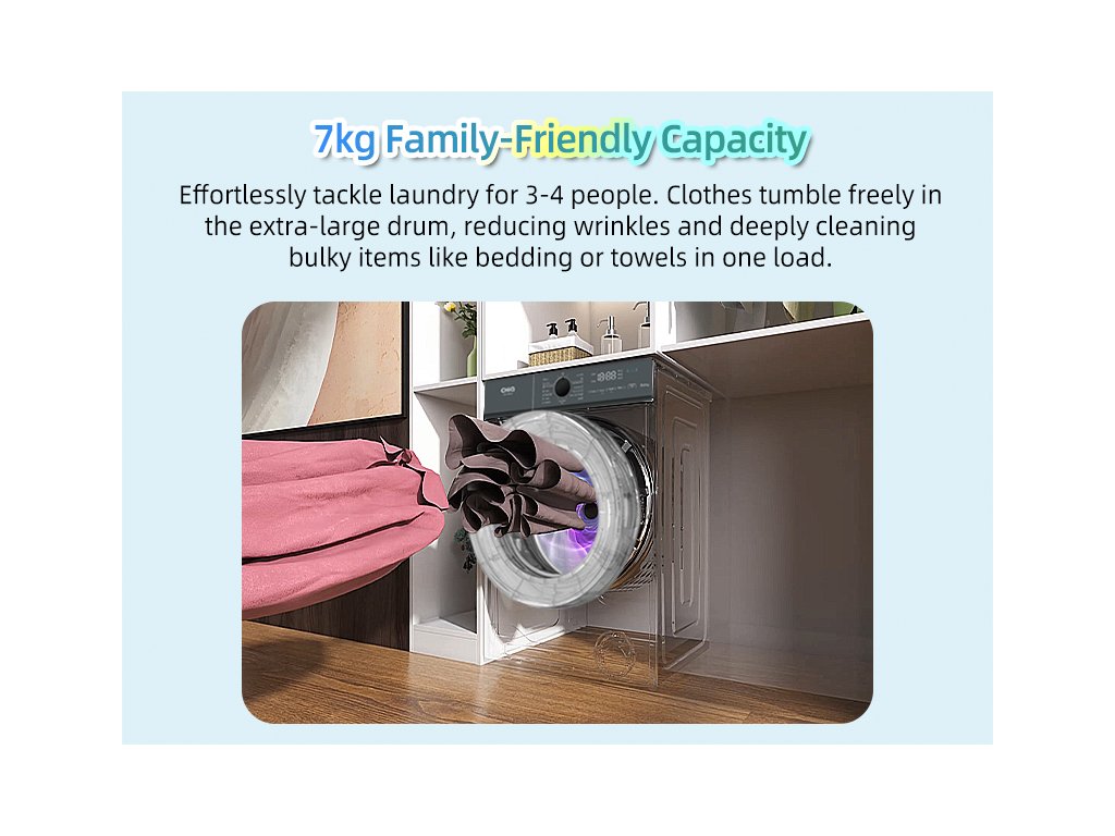 Aby pračka byla zabírala méně místa (hloubka jen 46,5 cm), tak jsme buben zúžili a zvětšili jeho průměr. Pračka má tak dostatečný objem bubnu pro vyprání 7 kg prádla. Díky malému půdorysu se ideálně vejde do nejmenších prostor, takže je skvělou volbou pro malé domy, byty či univerzitní koleje.