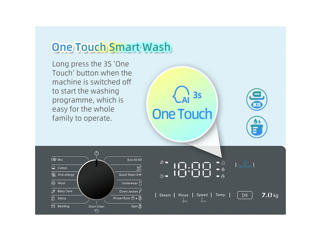 Chytrý prací program sám rozpozná množství vloženého prádla a nastaví optimální množství vody, dobu praní, počet máchání a otáček odstředění. Nemusíte volit žádný z pracích programů ani jej upravovat, pouze stiskněte tlačítko One Touch. Pračka sama zváží vložené prádlo a podle jeho hmotnosti zvolí jeden ze tří pracích cyklů.