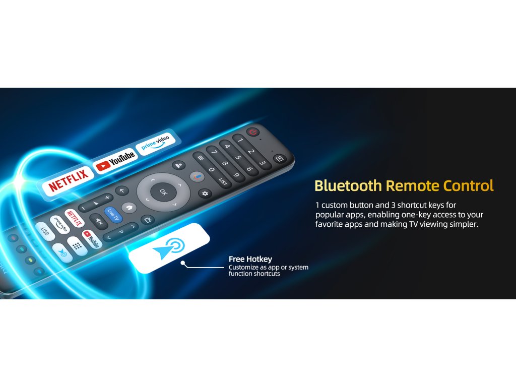 Také dálkový ovladač je vyrobený z materiálů nejvyšší kvality. Zajistí rychlou a příjemnou komunikaci s televizorem. Vyhrazená tlačítka pro Netflix, YouTube, Google Play nebo Prime Video vás rychle přivedou k obsahu, který hledáte.