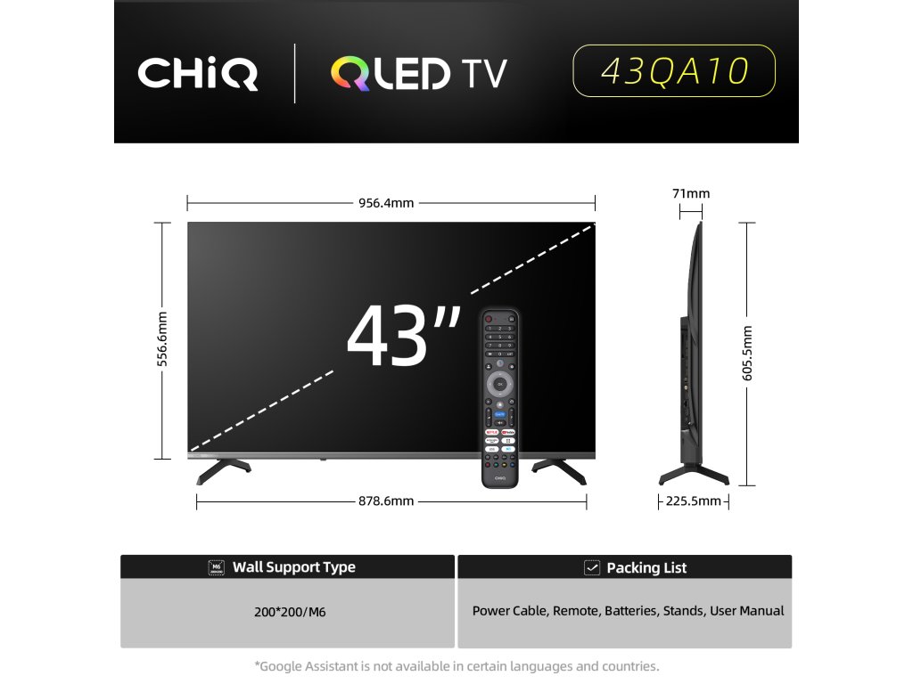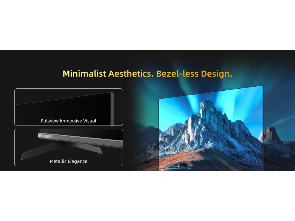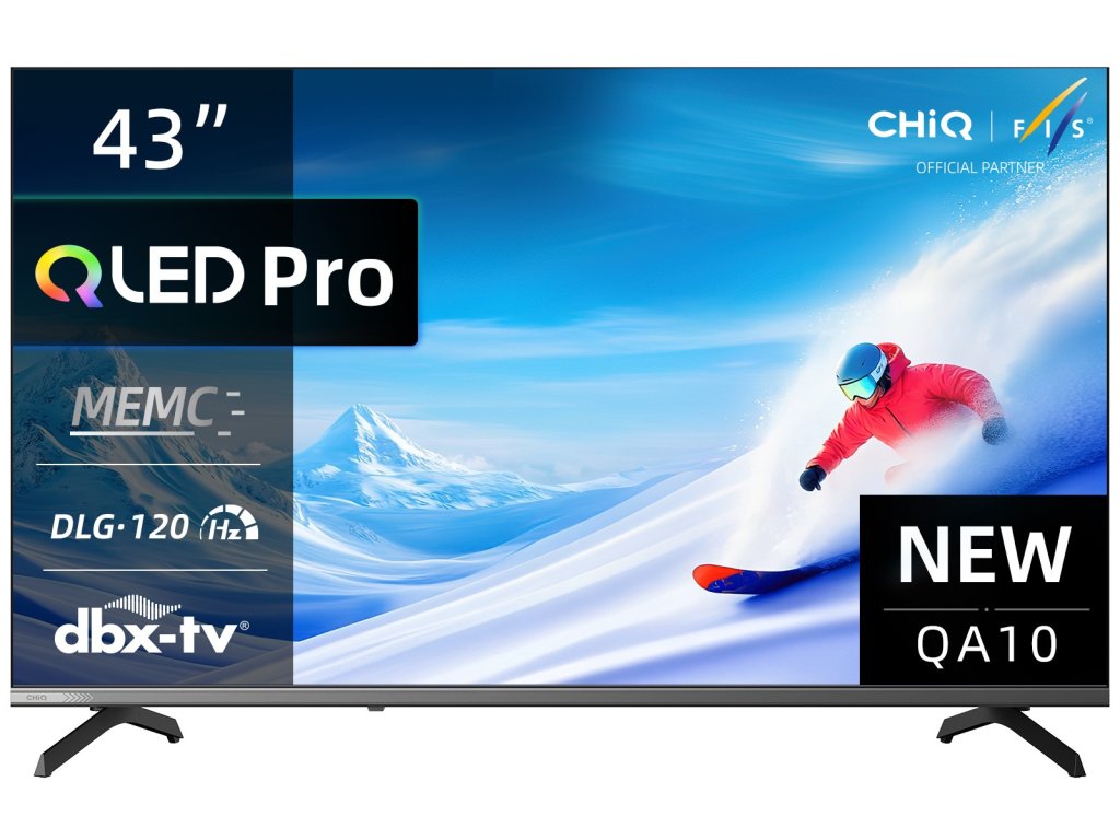 CHiQ 43“ 43QA10, ultratenká metalická bezrámečková QLED Smart Google TV 5.0 s několika herními funkcemi, HDR10, HLG, obrazovkou s Ultra HD s rozlišením 3840 x 2160 pixelů, prostorovým zvukem Dolby Audio a dbx-tv.
