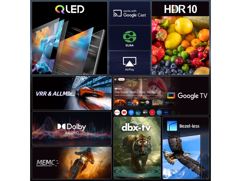 43QA10 je nová ultratenká metalická bezrámečková QLED Ultra HD Google TV 5.0 s DLG 120 Hz, MEMC, VRR, ALLM, větší pamětí 2+16GB, Dolby Audio a vylepšeným zvukem dbx-tv