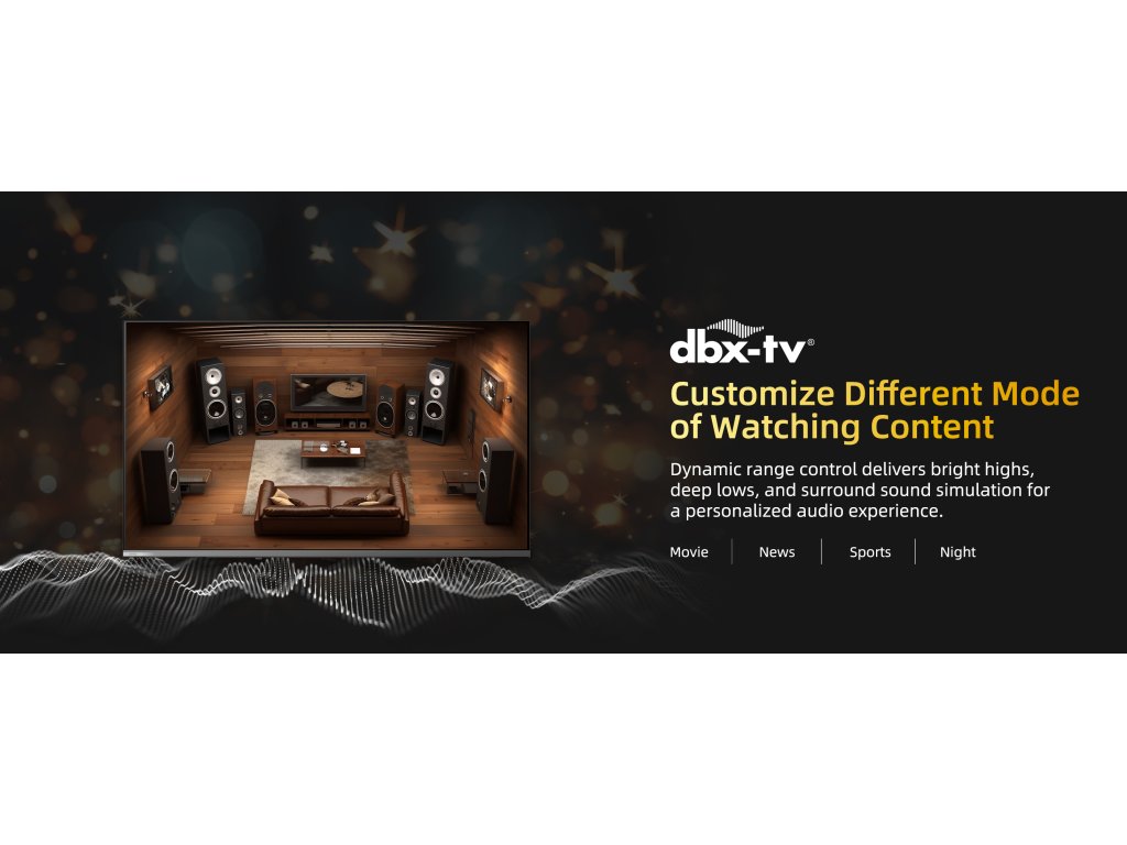 Úžasný zvuk a hlubší propojení s obrazem. Díky pokročilému nastavení přináší 5 pásmový ekvalizér do vašeho domova ohromující, vícevrstvý zvukový zážitek jako v kině. Také je připravena vám poskytnout vynikající vylepšení zvuku dbx-tv, které vzešlo od předních světových vývojářů zvukových technologií. Toto řešení zahrnuje: