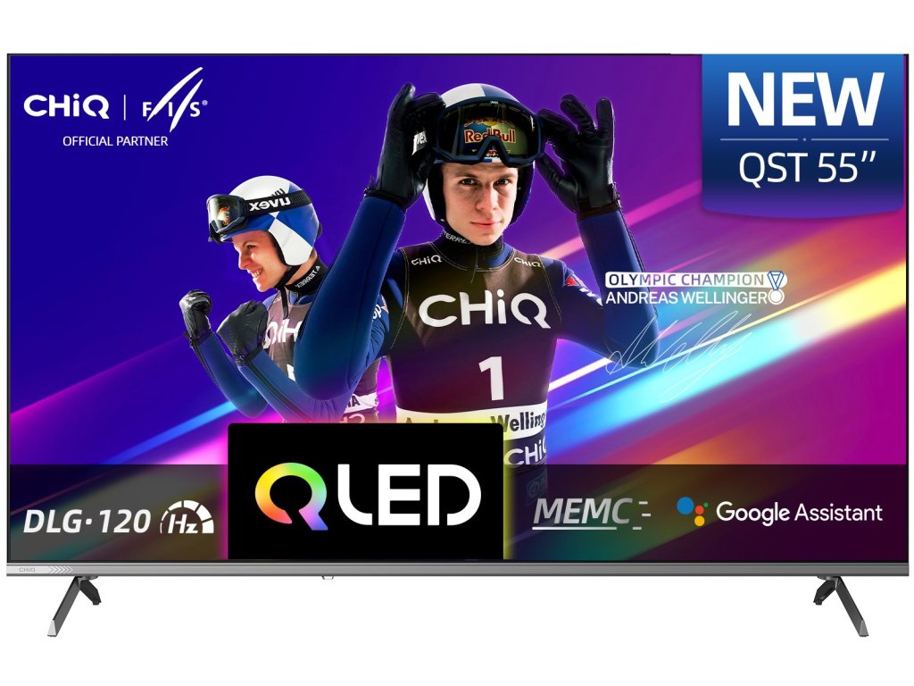 CHiQ U55QST, 55" (139 cm), ultratenká metalická QLED Google TV 5.0, Ultra HD (4K), DLG 120 Hz, MEMC, VRR, ALLM, Dolby Audio, dbx-tv, HDR 10, HLG, WiFi 2,4/5G, Bluetooth 5.0, webový prohlížeč, Google Assistant, Chromecast, Oneplay, YouTube, Netflix, Prime Video, paměť 2GB+16GB, 4x HDMI, 2x USB, CI slot, 20 W, energetická třída F.